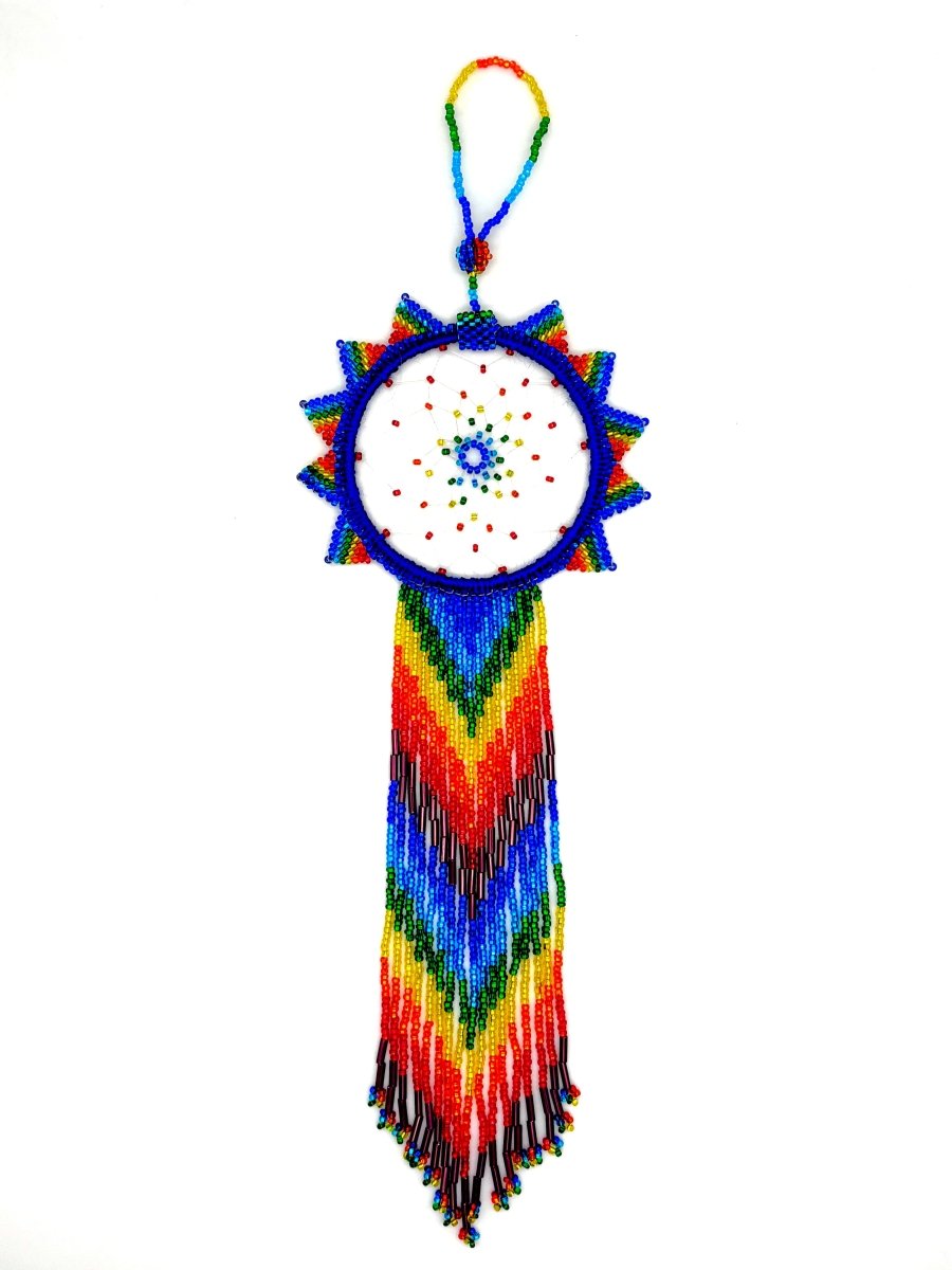 Our Navy Rainbow Sun Dreamcatcher reflects the mysteries of the night sky, handcrafted with radiant Czech glass seed beads that shimmer like constellations when they catch the light. Handmade by Indigenous Mayan women artisans in Guatemala, each piece is created with precision and care, ensuring authenticity and fair-trade impact.