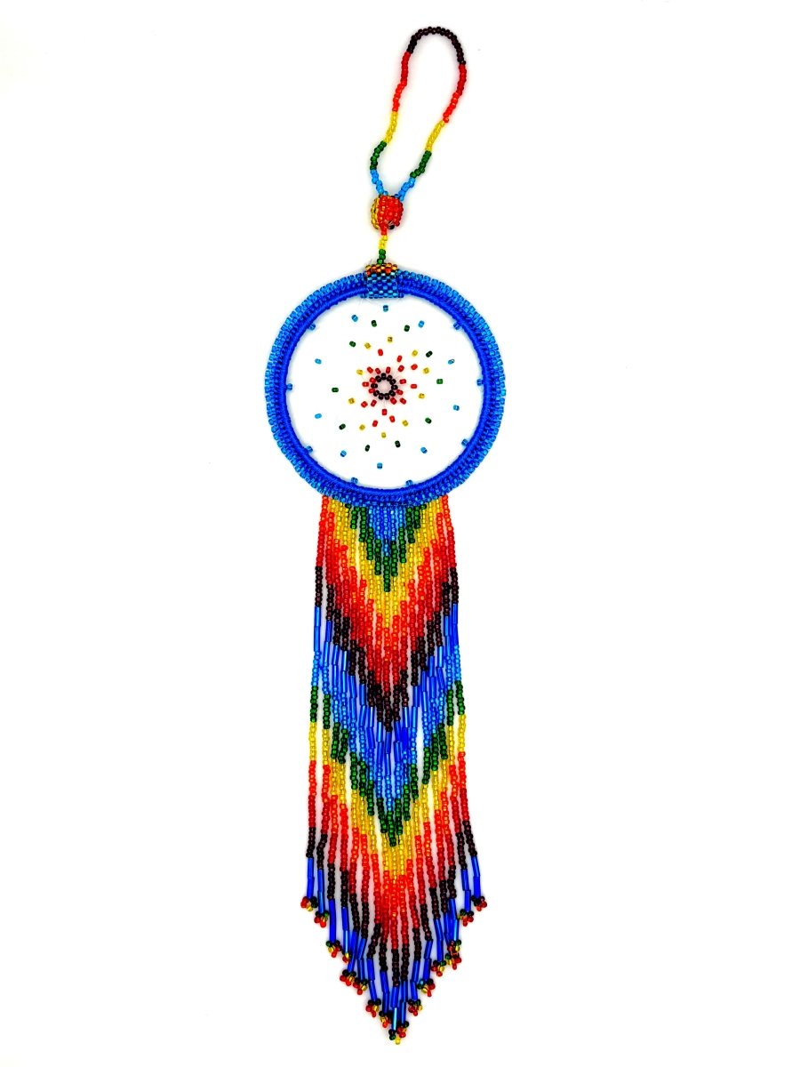 Our Blue Rainbow Dreamcatcher radiates calm, serenity, and vision. Handmade by Indigenous Mayan women artisans in Guatemala, it is adorned with luminous Czech glass seed beads that reflect sunlight in breathtaking ways, glowing like drops of water across the woven web.
